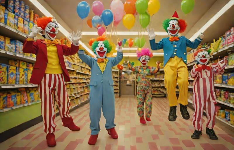 Here. Here’s a picture of clowns doing jumping jacks in a candystore.